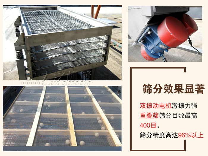 直線振動篩采用雙振動電機反向同步驅(qū)動,運行可靠,激振力強,有重疊篩選法、分層序列法以及聯(lián)合篩選法,篩分目數(shù)高400目,篩分精度高達(dá)96%以上,可篩選出7種粒度規(guī)格不同的物料。