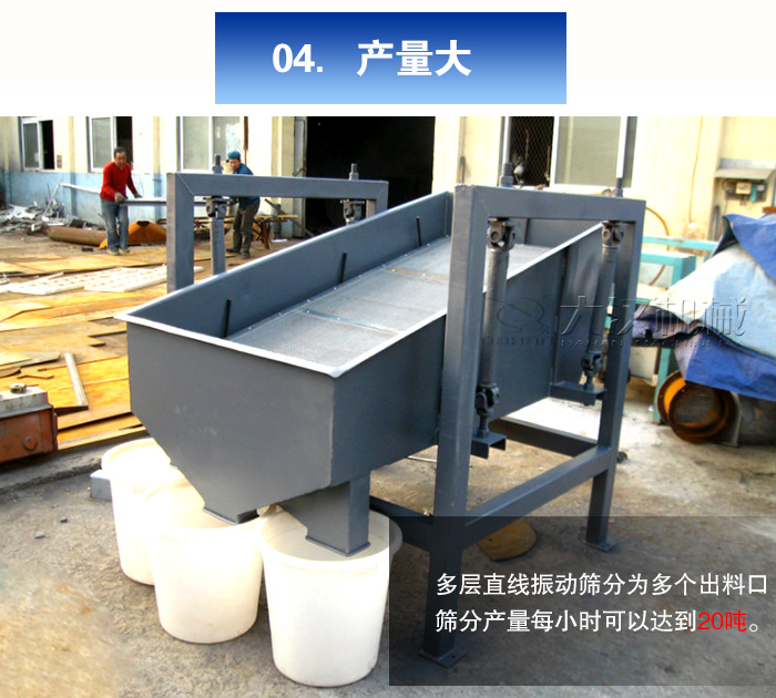多層直線振動(dòng)篩分為多個(gè)出料口,可把篩分物料按大小粒度分為多個(gè)等級(jí),物料篩分規(guī)格多,篩分后的物料可以自動(dòng)排出,采用雙臺(tái)電機(jī)驅(qū)動(dòng),振動(dòng)力更強(qiáng),物料篩分更徹底,篩分產(chǎn)量每小時(shí)可以達(dá)到20噸。