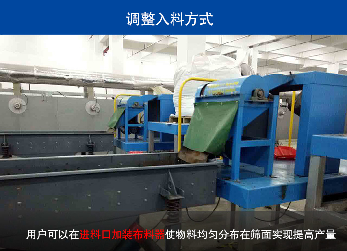 在玉米篩選過程中如給料不均勻,入料時不是沿全網寬度給入就會造成篩面利用率不充分從而降低產量和篩分精度。對于這問題用戶可以在進料口加裝布料器使物料均勻分布在篩面實現提高產量的要求,如無條件增加布料裝置可以在人工投料時注意均勻分散。