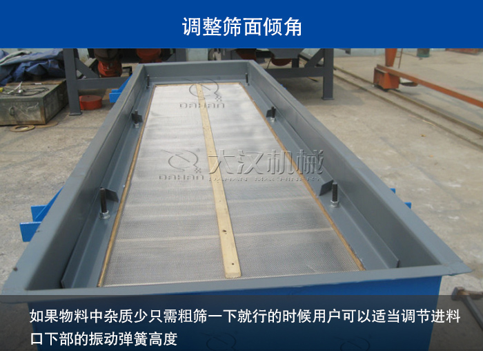 直線振動篩在設計時是有個傾斜角度的,通常情況下傾角為45°,但在實際使用過程中如果物料中雜質少只需粗篩下就行的時候用戶可以適當調節進料口下部的振動彈簧高度,進料口高度升高可以加快物料在篩面的運動從而實現提高產量的效果。