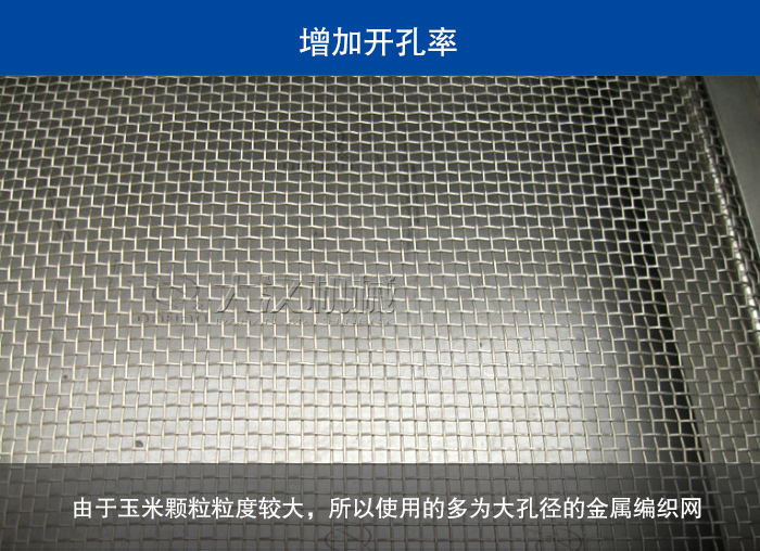 由于玉米顆粒粒度較大,所以使用的多為大孔徑的金屬編織網,在生產過程中想要提高產量也可以更換較之前孔徑較大的篩網進行生產,這樣也可以有效的提高玉米直線振動篩的產量。
