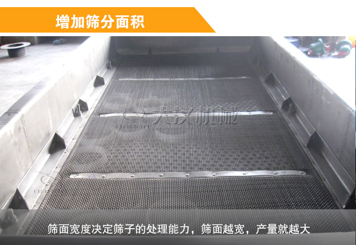 直線振動篩的篩分面積可以通過增加篩面的長度和寬度來實現,般情況下,篩面寬度決定篩子的處理能力,篩面越寬,產量就越大;篩面長度決定篩分效率,篩面越長,物料篩分時間約長,效率就越高,但是篩面長度達到定尺寸后,篩分效率提高很少,甚至不再提高,此時再增加篩面長度只會增加篩子的體積和重量。