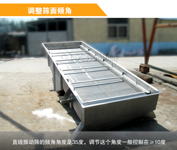 篩面傾角傾角大,料層在篩面上向前運動的速度就快,產量就大,但物料在篩面上停留的時間縮短,減少了顆粒透篩機會,降低了篩分效率,直線振動篩的傾角角度是35度,調節這個角度般控制在≥10度,需要注意的繼續調高就達不到篩分的效果了。